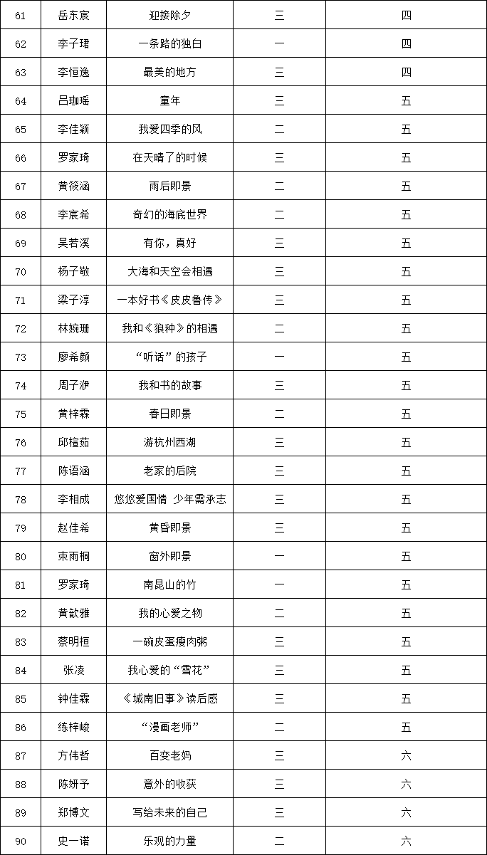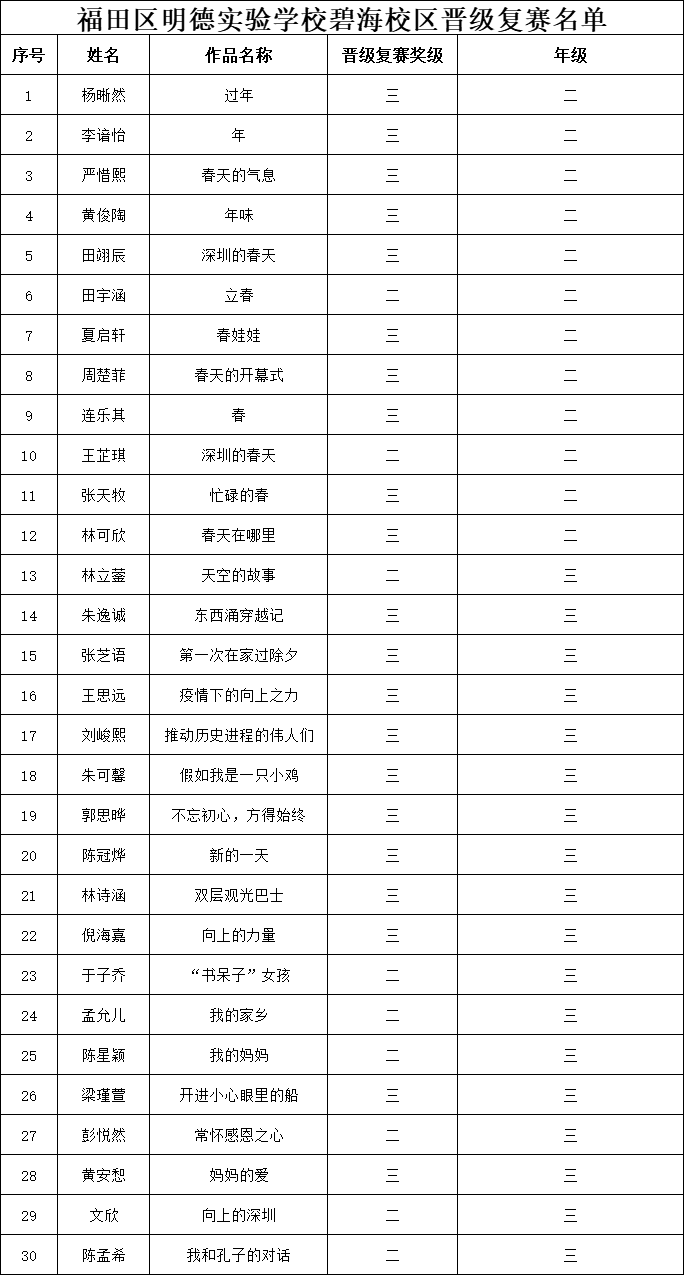 自2021年1月,活動征稿啟動以來,獲得了深圳市廣大中小學(xué)生、教師、文學(xué)愛好者的熱烈響應(yīng)積極參與,吸引了深圳百余所學(xué)校的上萬人關(guān)注報名?,F(xiàn)公布福田區(qū)明德實驗學(xué)校碧海校區(qū)專場晉級復(fù)賽名單如下: