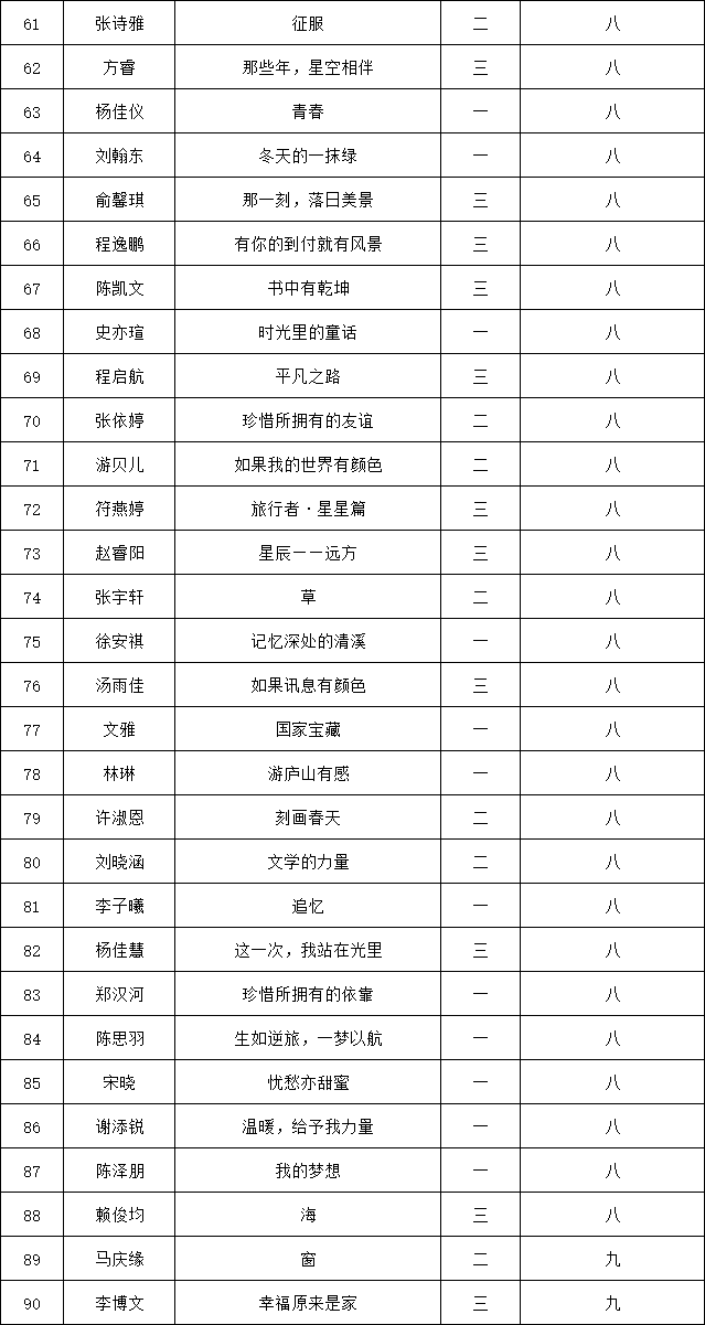 自2021年1月,活動(dòng)征稿啟動(dòng)以來,獲得了深圳市廣大中小學(xué)生、教師、文學(xué)愛好者的熱烈響應(yīng)積極參與,吸引了深圳百余所學(xué)校的上萬人關(guān)注報(bào)名?,F(xiàn)公布南山實(shí)驗(yàn)教育集團(tuán)前海港灣學(xué)校(初中部)專場(chǎng)晉級(jí)復(fù)賽名單如下: