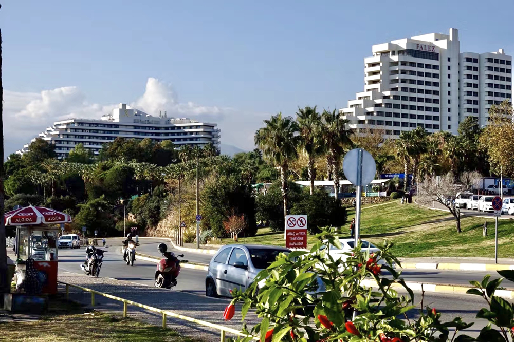 安塔利亞被群山環(huán)繞,成行的棕櫚樹構(gòu)成一條條林蔭大道,西面是一望無際的拉拉沙灘,南瀕清澈的地中海,北臨郁郁叢叢的托羅斯山脈。市區(qū)人口約60萬,每年夏季有大量游客,特別是俄羅斯人涌入。李仁奇 攝