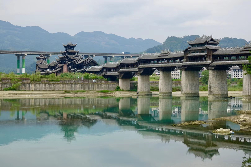 濯水廊橋長658米、寬5米,分為橋、塔、亭三部分,橋身為純木結構,建筑材料之間以榫頭卯眼互相穿插銜接,直套斜穿,牢固精密。李仁奇 攝