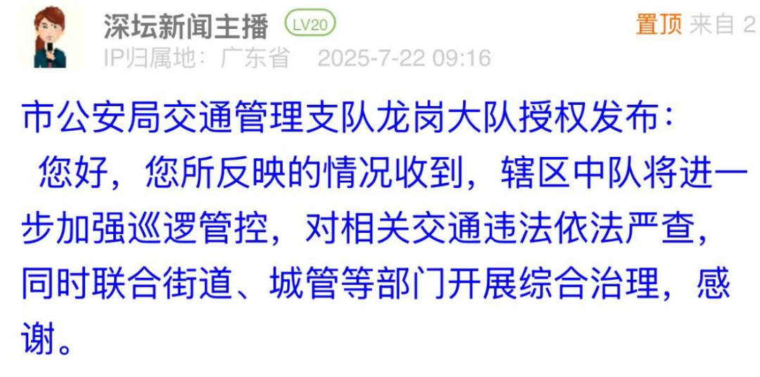 案例點評:對于市民反映的路面油污問題,布吉街道辦立即安排環(huán)衛(wèi)部門進行清洗,并于第二日在問政帖文下進行回復,以現(xiàn)場圖片展示路面清理效果,表示將加強后續(xù)巡查。此次處置展現(xiàn)了基層部門高效務實的問題處理能力,為城市道路環(huán)境管理提供了快速響應與長效維護相結(jié)合的實踐范例,切實回應了市民對潔凈環(huán)境的期待。