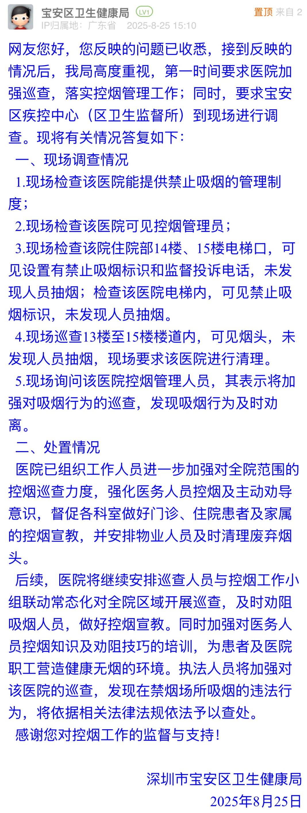 優(yōu)化建議:接到市民反饋后,寶安區(qū)衛(wèi)生健康局快速組織現(xiàn)場調(diào)查,核實醫(yī)院有禁煙制度、控?zé)煿芾韱T在崗,基礎(chǔ)控?zé)煷胧┖瞬榈轿?,值得點贊。但回應(yīng)中多次強調(diào)“未發(fā)現(xiàn)人員抽煙”,回避對歷史吸煙行為處置、煙頭來源及勸阻機制失效的解釋,與市民關(guān)切脫節(jié),難以消除市民對醫(yī)院日常控?zé)熌芰Φ膿?dān)憂,建議完善具體控?zé)煷胧缂友b煙感報警裝置,建立核查公示制度等,筑牢“無煙醫(yī)院”防線。