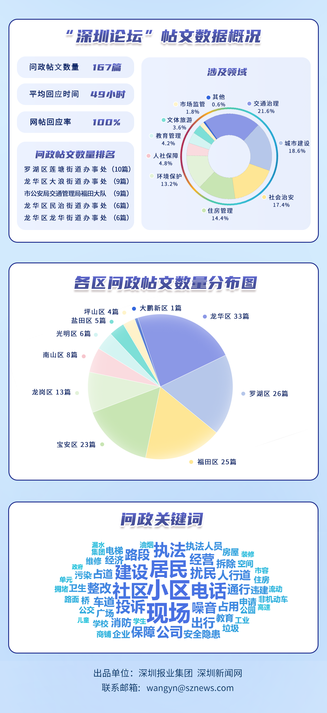 為探尋媒體如何精準賦能基層治理現(xiàn)代化的“深圳路徑”,深圳報業(yè)集團正式掛牌成立“問政深圳”工作室,旨在進一步推動網(wǎng)絡(luò)問政工作的高效開展。為確保相關(guān)工作更加契合實際需求,自上期起,深圳報業(yè)集團深圳新聞網(wǎng)按照“最快速度辦結(jié)”的總體要求,將原有月度榜單創(chuàng)新升級為“問政深圳紅黑榜”,并對評分體系進行了細致優(yōu)化。該榜單從答政量、回應(yīng)率、響應(yīng)時效及解決成效等多個維度,對深圳各級黨政機關(guān)及公共企事業(yè)單位進行答政實效評議,力求打造政府與媒體攜手共進、創(chuàng)新基層治理現(xiàn)代化的新樣板,從而更好地回應(yīng)人民群眾對美好生活的熱切期盼。