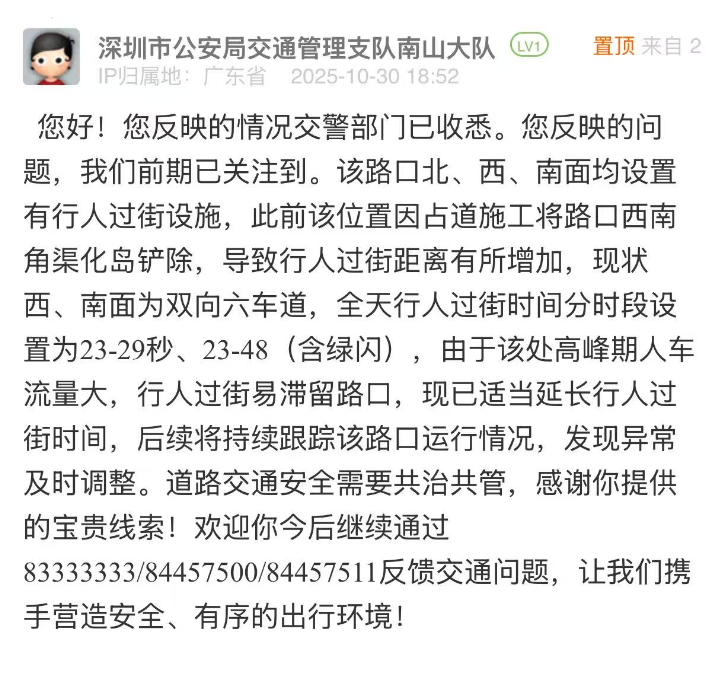 案例點評:南山交管部門在24小時內對市民所反饋的問題進行答復,展現(xiàn)出精準、高效的治理態(tài)度,既說明過街時間短的原因,又根據(jù)該路口在高峰期人流大的實際情況,適當延長過街時間,體現(xiàn)出“因需調整、務實便民”的理念。回應中,該部門還強調后續(xù)將持續(xù)跟蹤路口通行情況、及時優(yōu)化調整等,展示了精細化治理的決心和理念。